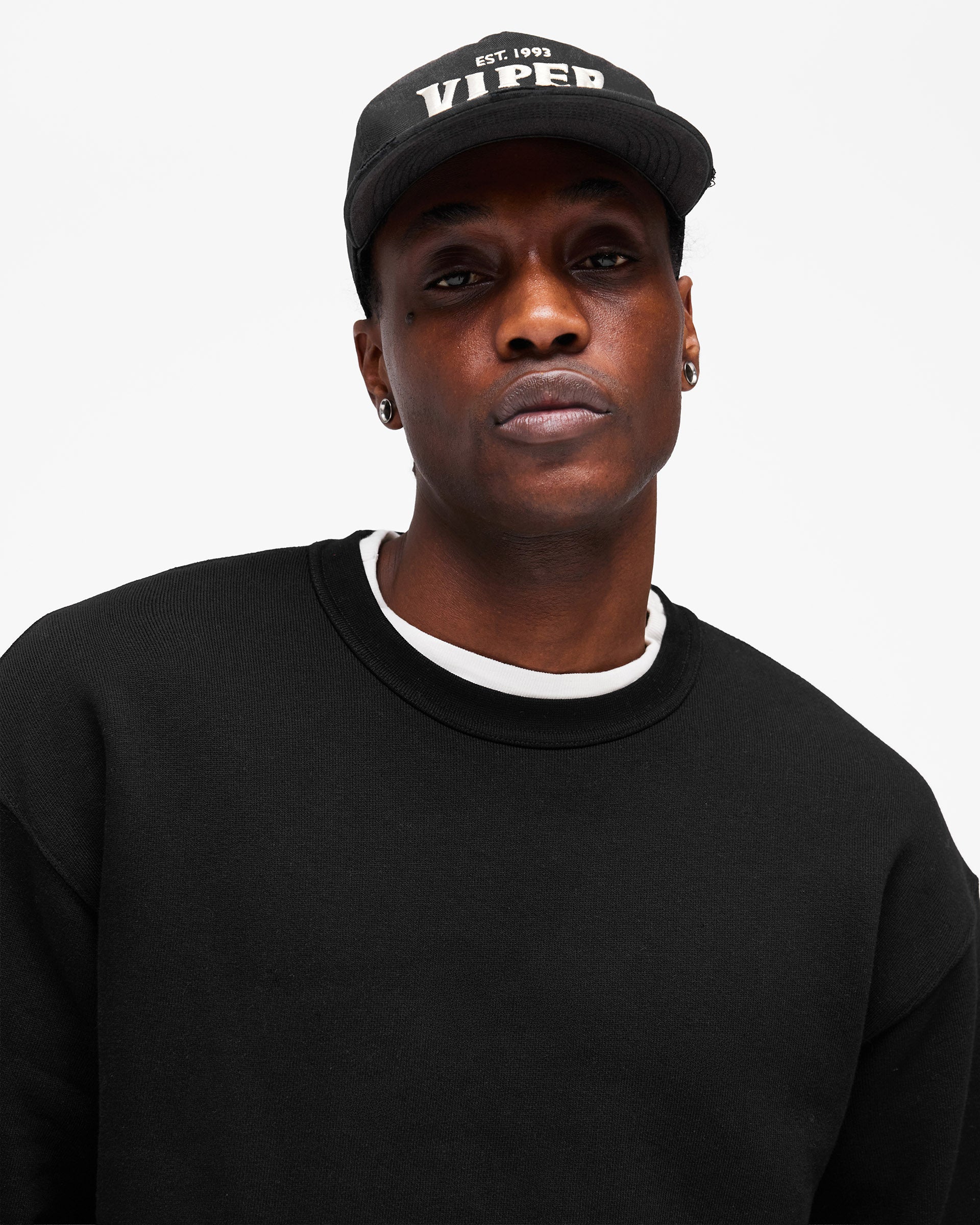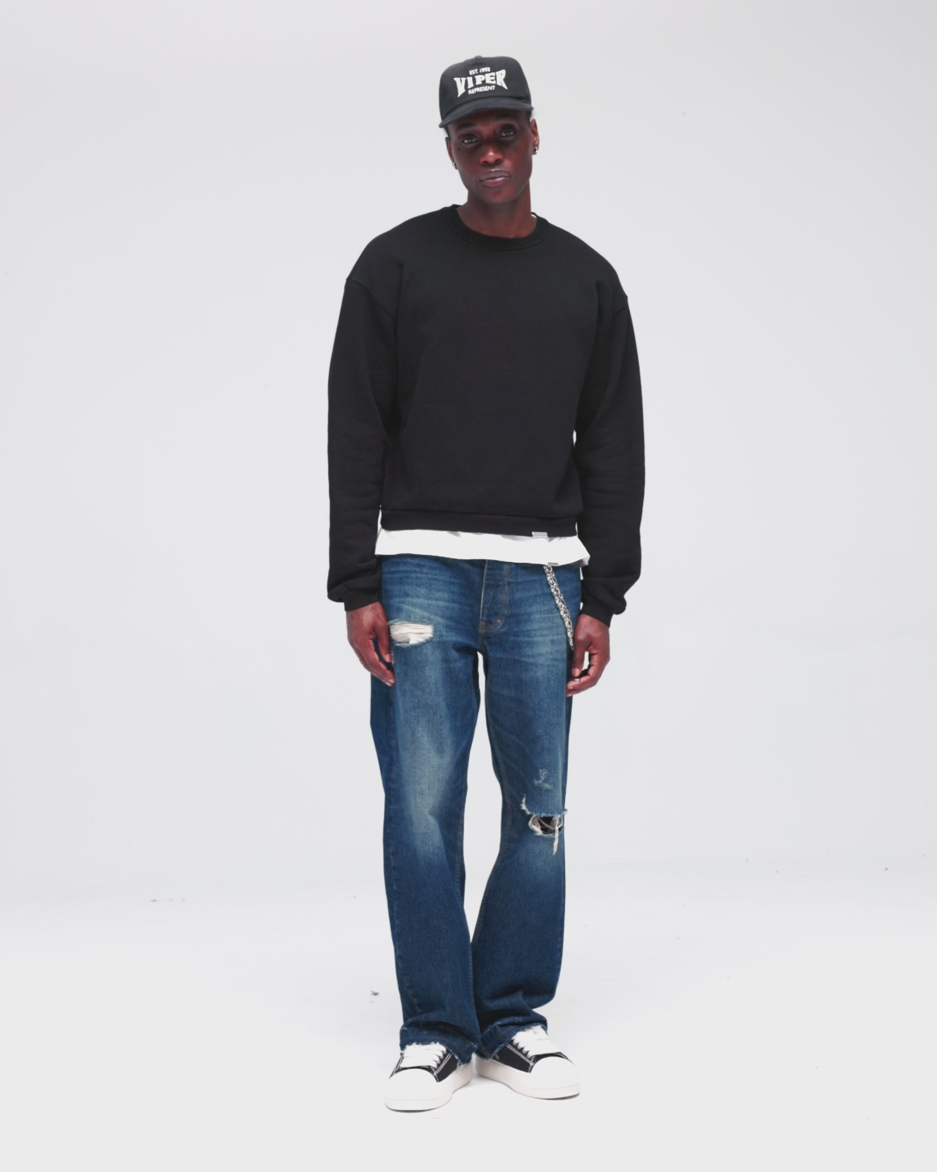 Wir präsentieren das GH Shrunken Sweatshirt in Jet Black, ein Regular Slim Fit Crewneck-Sweatshirt aus 370 g/m² gebürsteter Loopback-Baumwolle mit körniger, Vintage-inspirierter Oberflächenstruktur außen und weich gebürstetem Inneren. Als Teil der Heaton Capsule führt dieses Piece einen neuen Fleece-Stoff in das Represent Sortiment ein, aufgebaut um George Heatons Wertschätzung für die Konstruktion amerikanischer Vintage-Sportswear. Die Oberfläche entwickelt mit der Zeit Charakter und setzt sich zu einem eingetragenen Gefühl, das mit jedem Tragen besser wird.