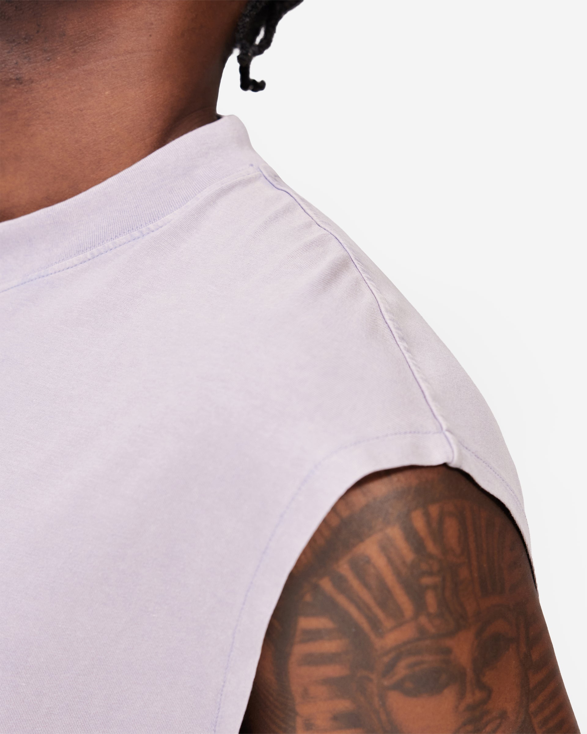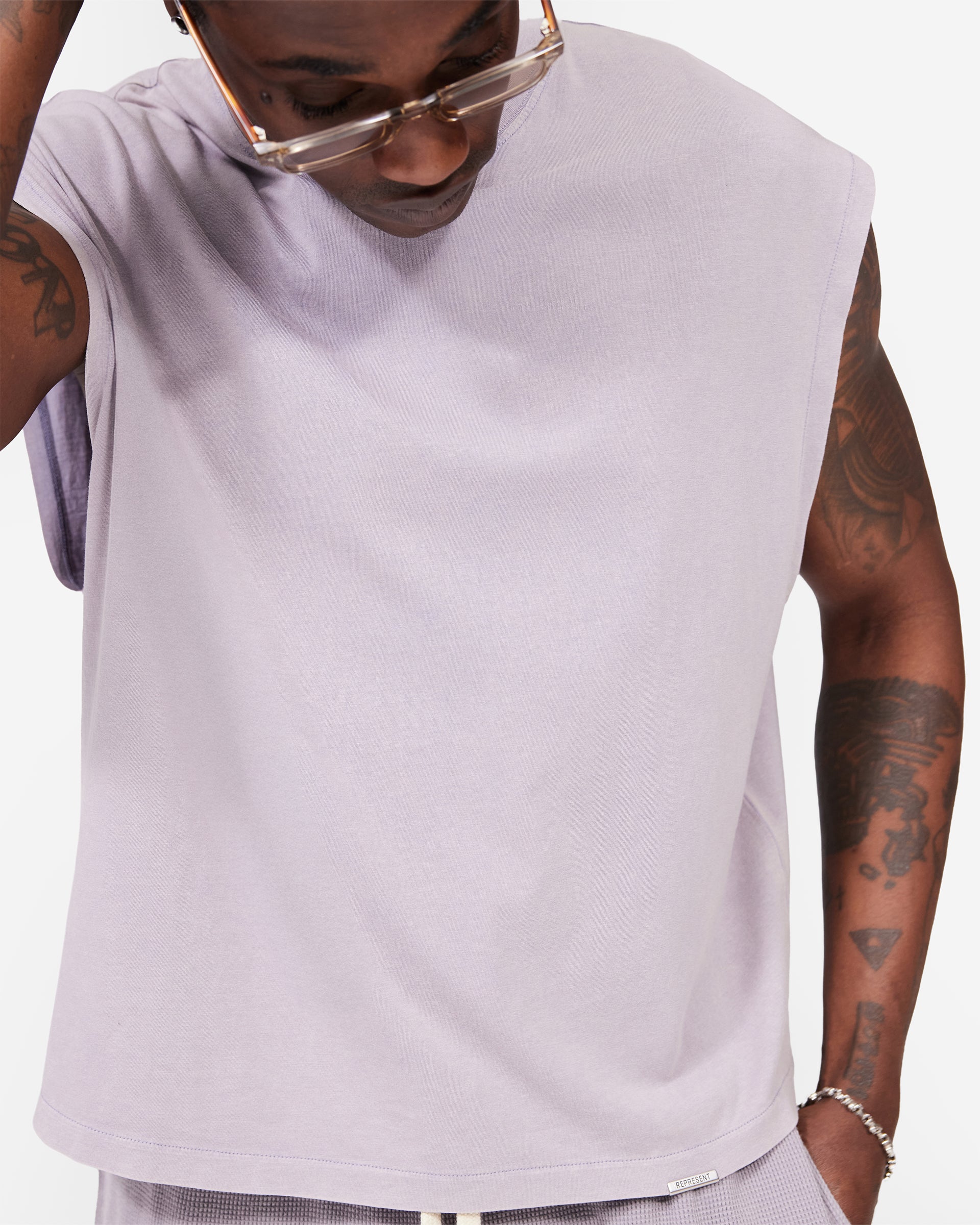 Introducing das Initial Boxy Tank in Mist, eine boxy, ärmellose Silhouette, gefertigt aus 140 g/m² Baumwoll-Jersey mit einer Fade-Out Waschung für ein weiches, eingetragenes Finish. Die breitere, eckige Form mit überschnittenen Schultern bietet eine entspannte, zeitgemäße Passform, gemacht für Layering bei warmem Wetter und mühelose Alltagslooks.