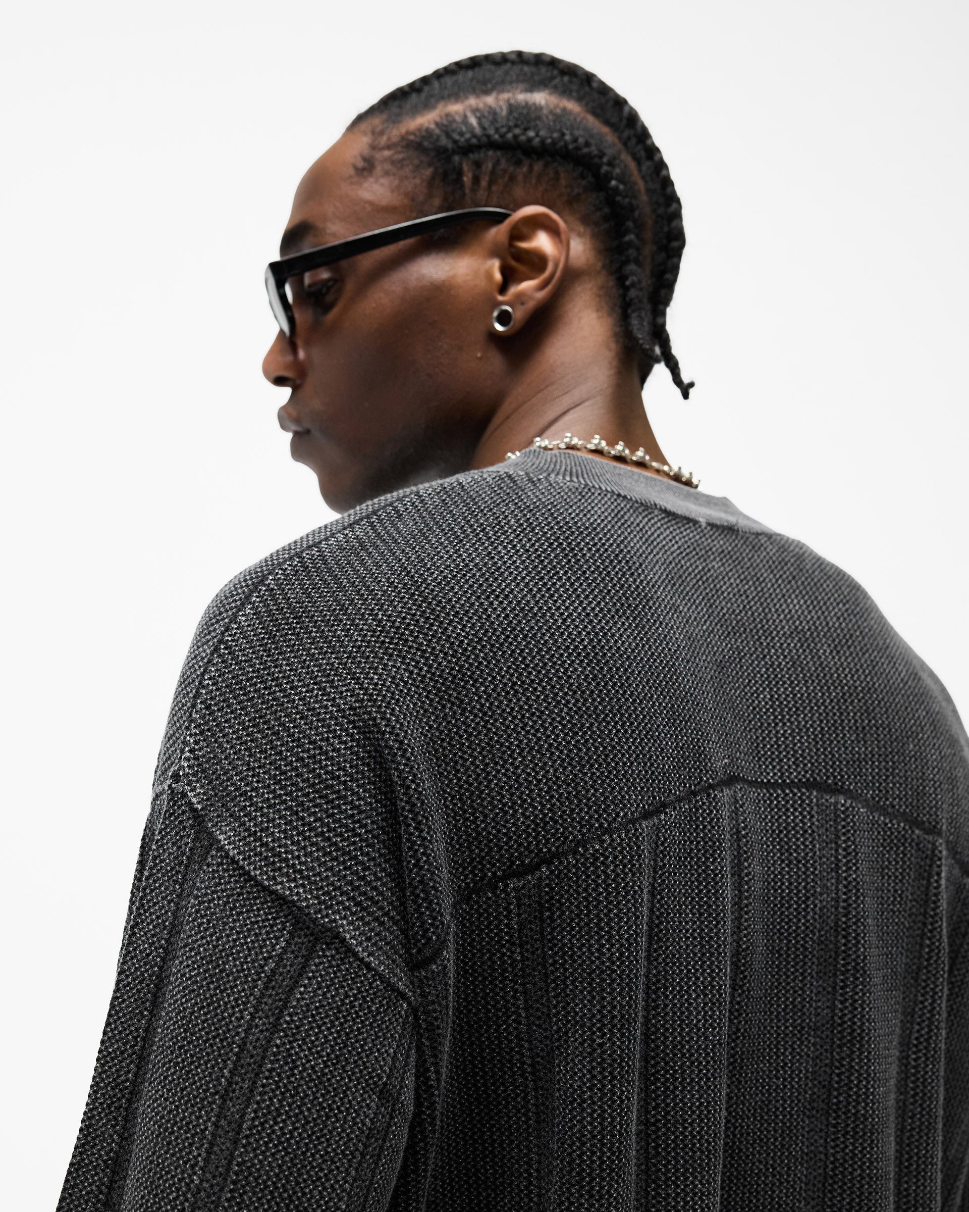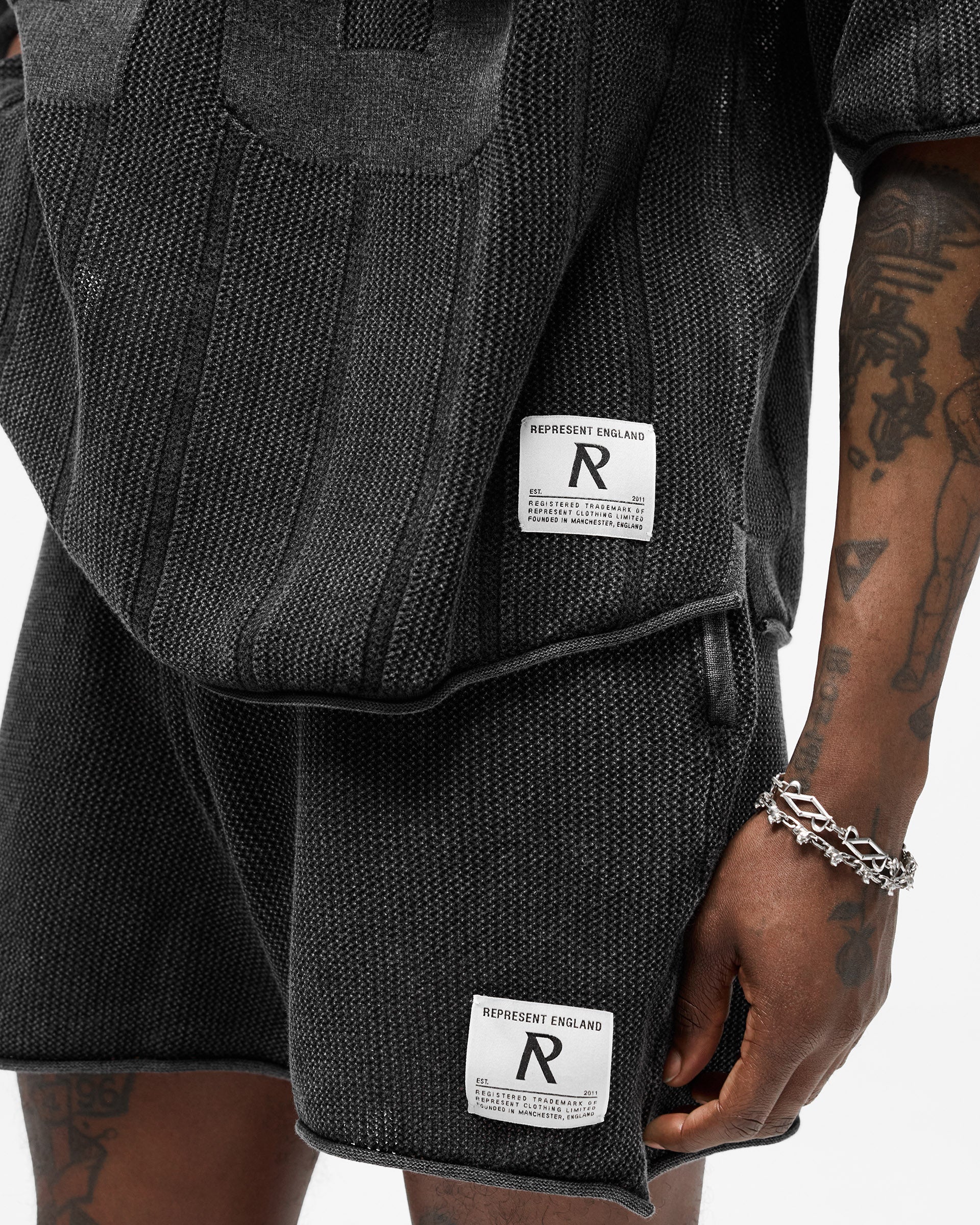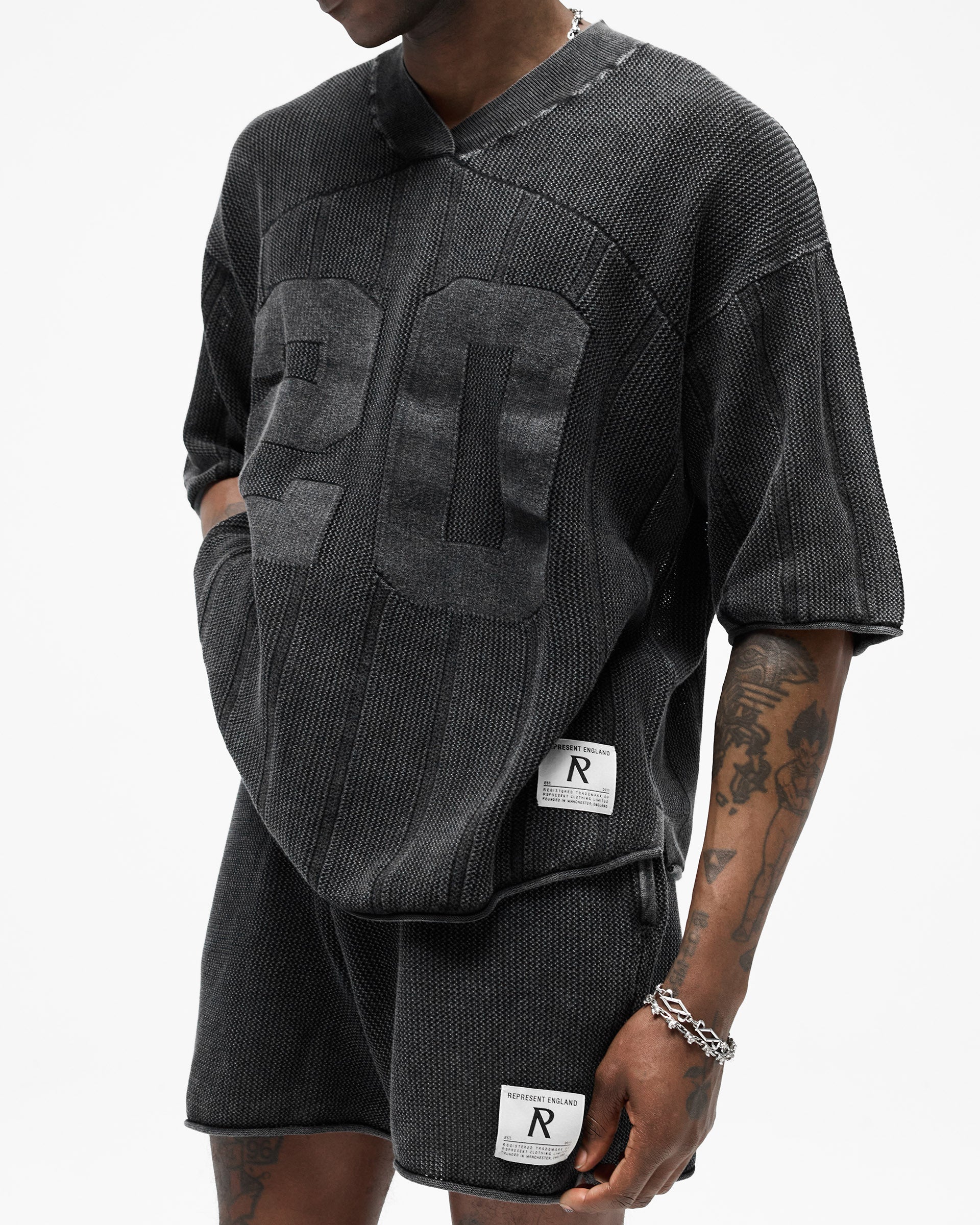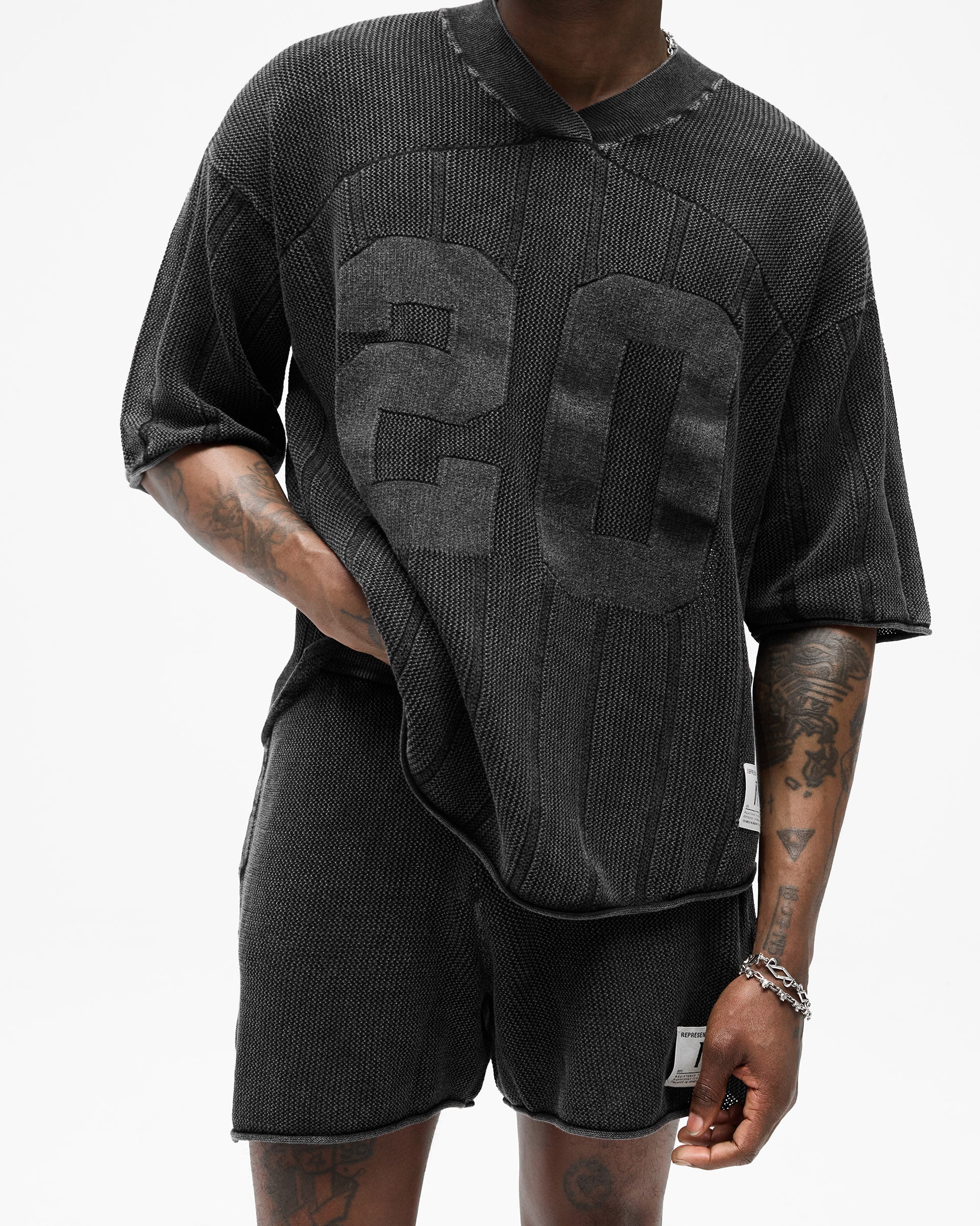 Wir präsentieren das Knitted Varsity Jersey in Vintage Grey, eine kurzärmlige Interpretation klassischer Varsity-Sportswear. Gefertigt aus Baumwolle in 12GG 2ply Meshstrick mit V-Ausschnitt und Rippkragen, zeigt dieses Piece eine Varsity-Passe vorne und hinten sowie ein Intarsienstrick-Artwork auf der Mitte der Vorderseite. Ein gewebtes Tab am Saum, gerollter Saum und Ärmelabschlüsse, Seitenschlitze und vollständig gelinkte Nähte vollenden die Konstruktion. Konzipiert als eigenständiges Teil oder als Styling-Partner zu den passenden Knitted Varsity Shorts.