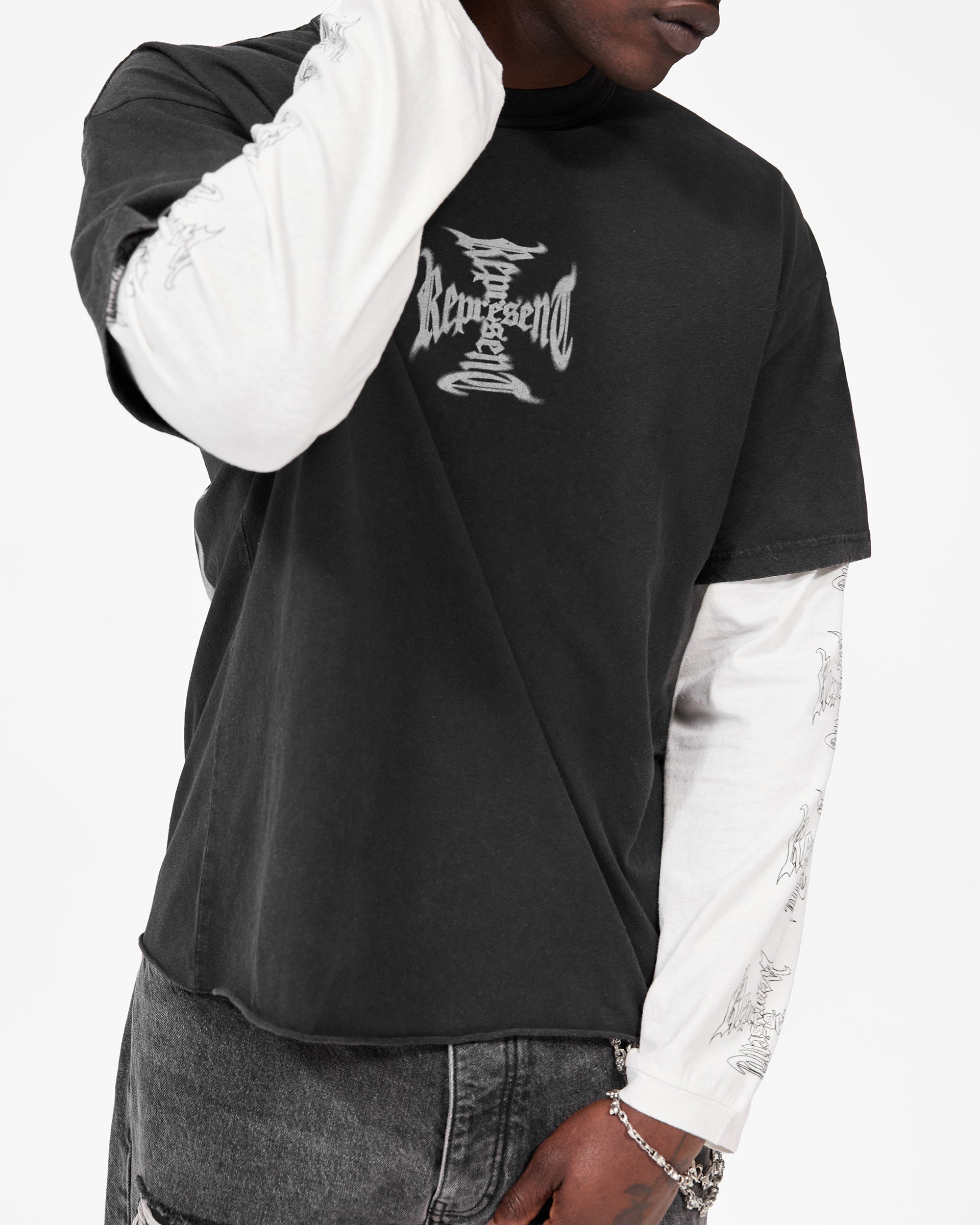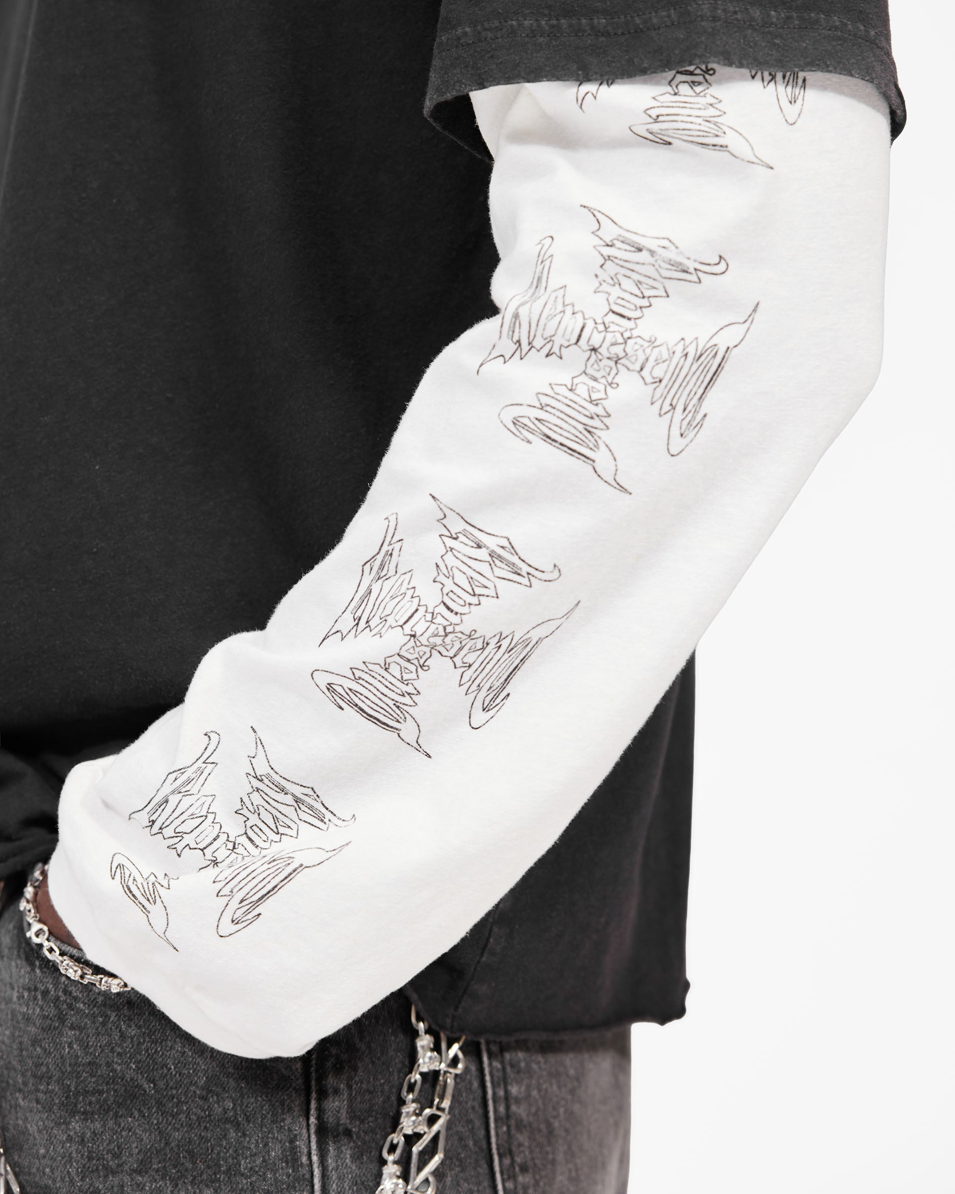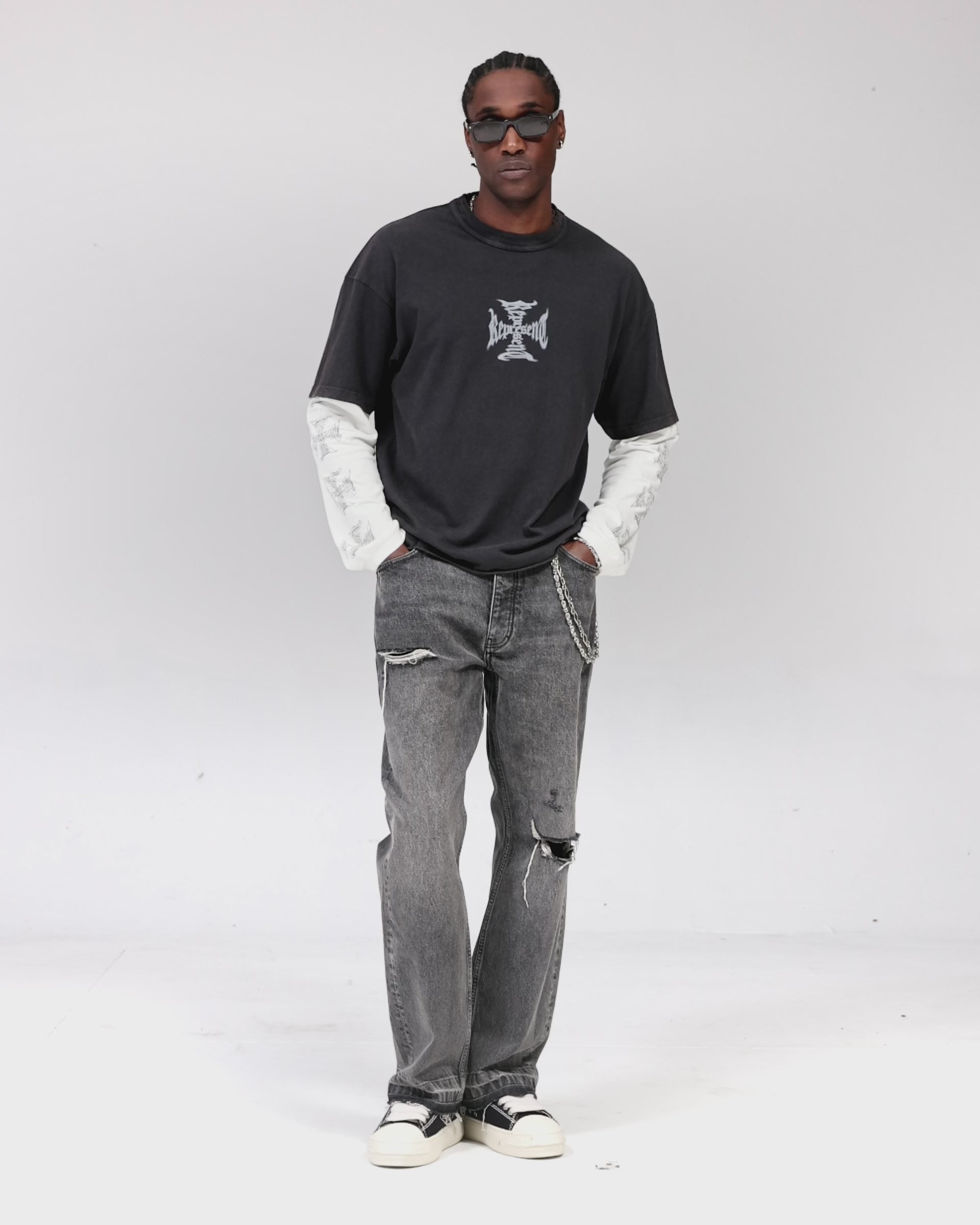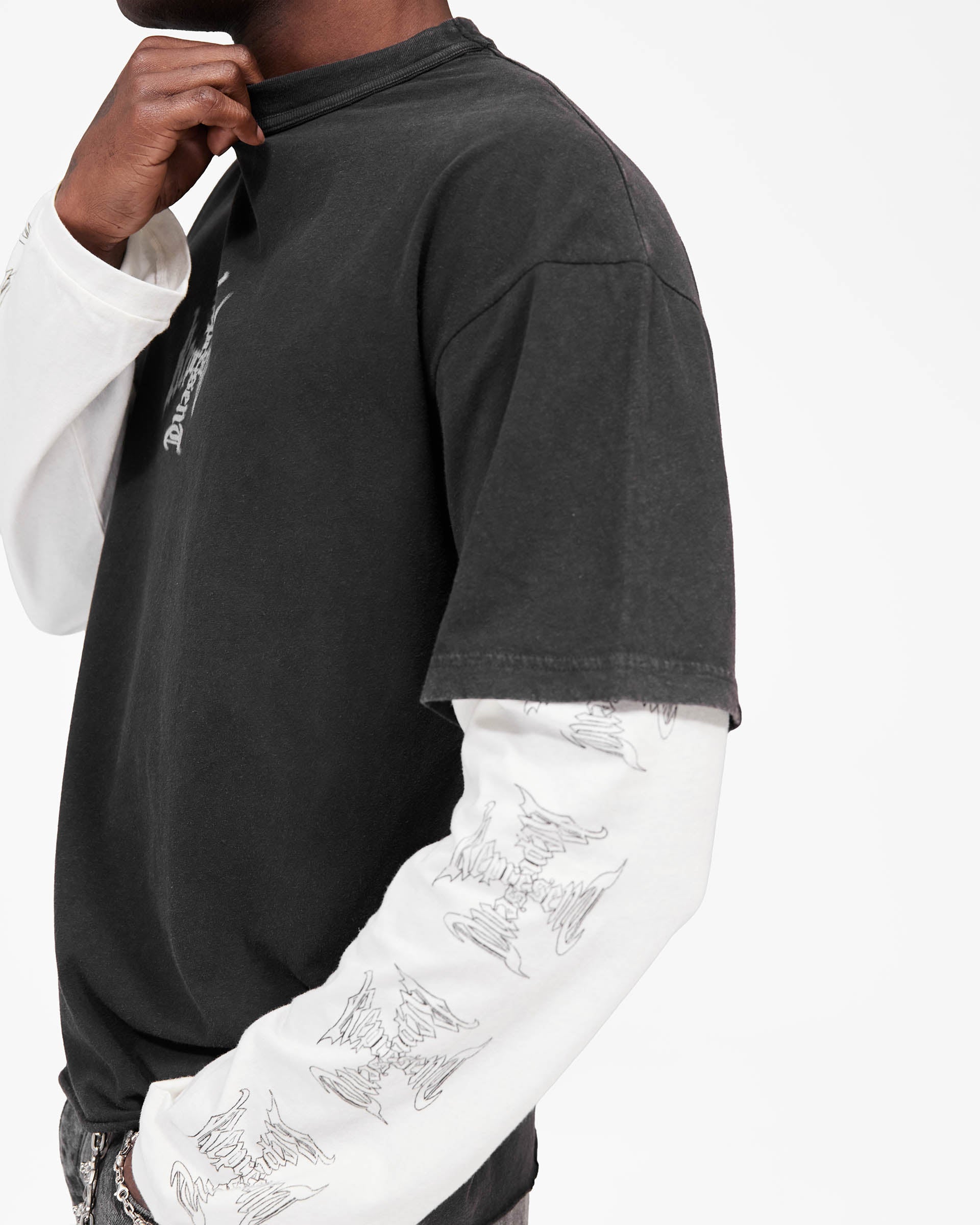 2-in-1-KonstruktionVerwaschenes schwarzes Kurzarm-Oberteil mit kontrastierenden weißen langen Ärmeln darunter.Baumwoll-Hanf-Mischung160 g/m² Slub-Jersey mit natürlicher Textur und Vintage-Charakter.Wasserbasierte GrafikenKreuzgrafik vorn und hinten mit Outline-Print über die Kontrastärmel.StückfärbungEinzigartige Waschung, die jedem Teil seinen individuellen Charakter verleiht.