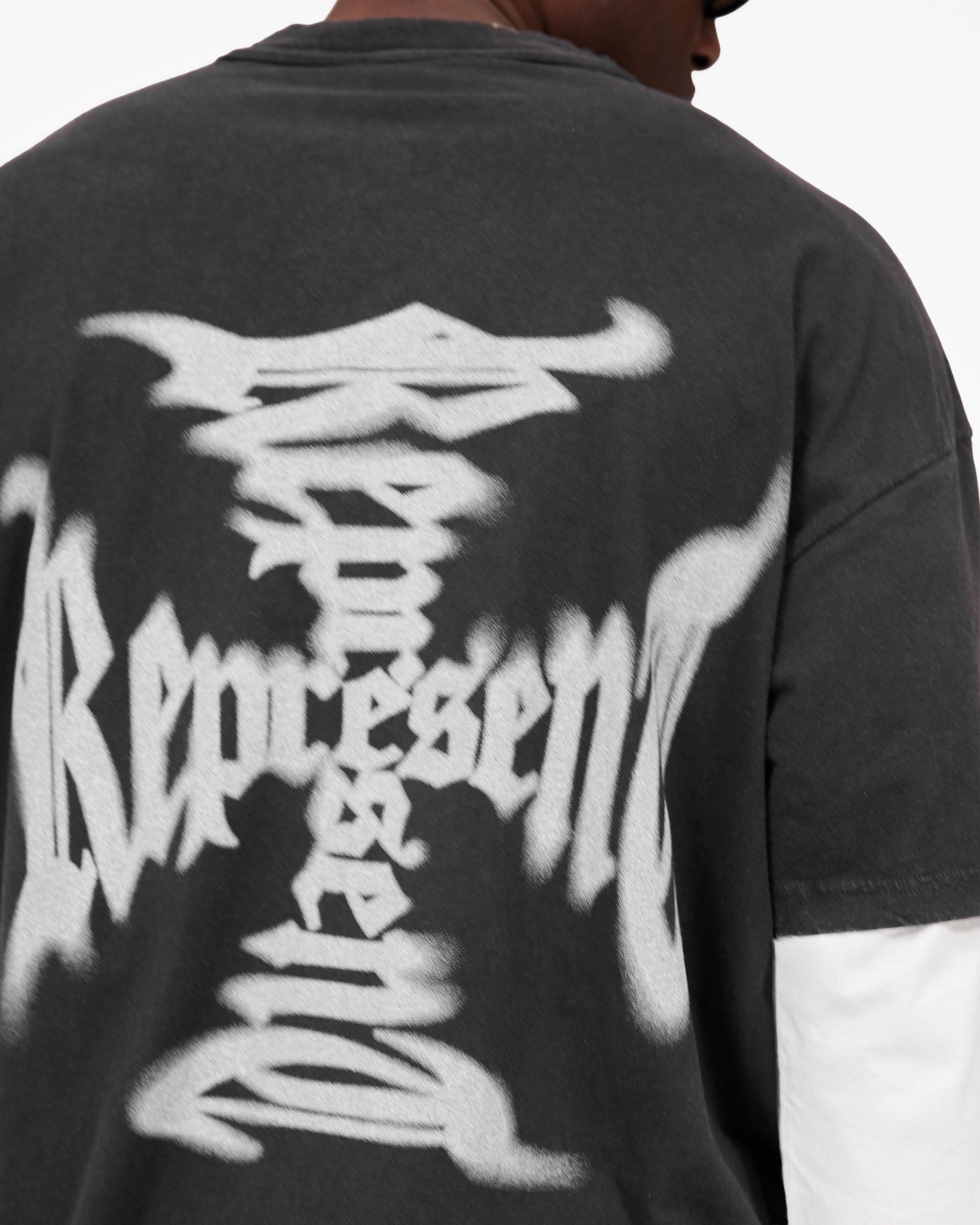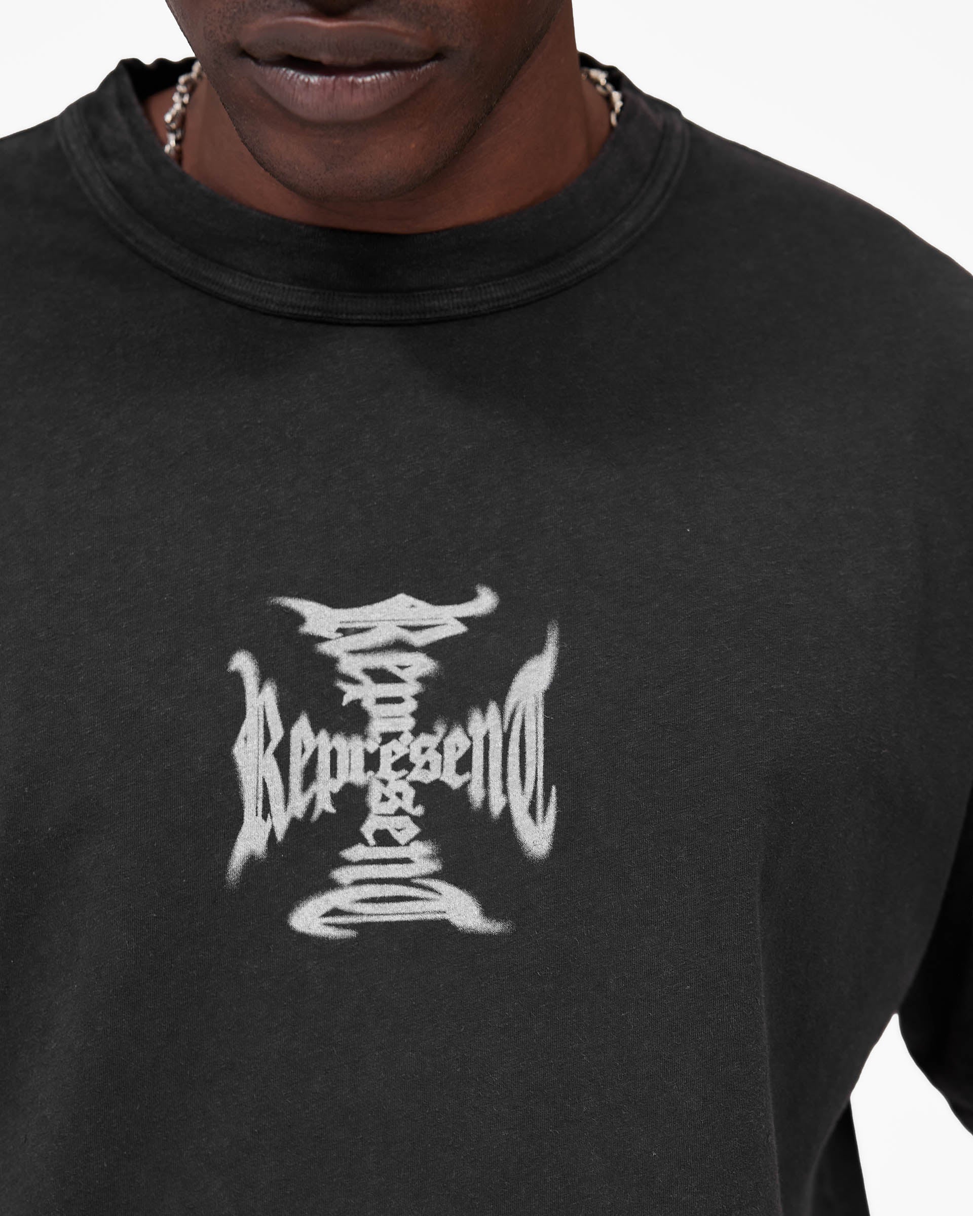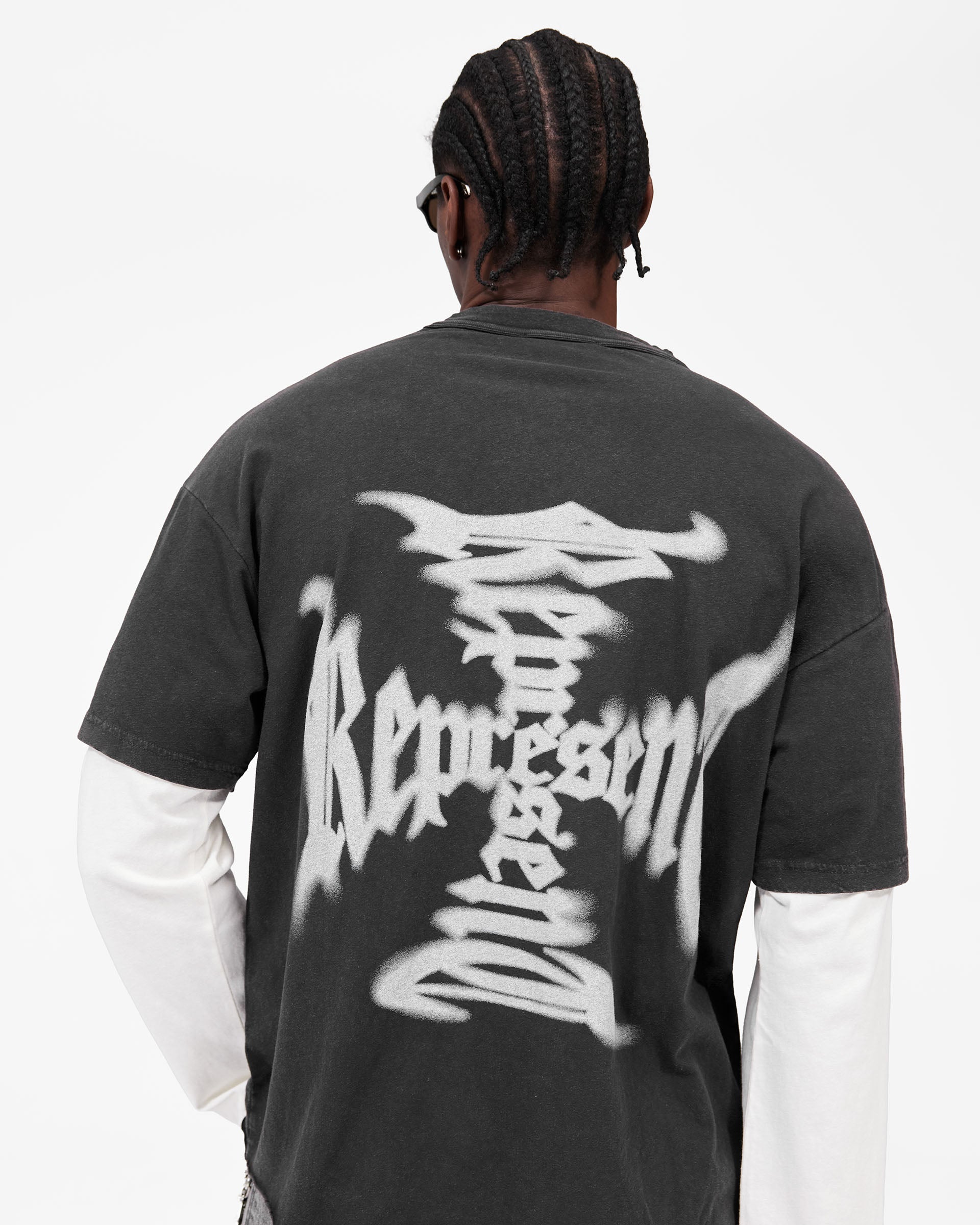 Mit einer Represent Kreuz-Grafik in wasserbasierter Farbe mittig auf der Vorderseite und einer größeren Ausführung über den Rücken, dazu ein wiederholter Outline-Print entlang der weißen Kontrastärmel. Abgerundet mit Rippkragen, Rohsaum und unserer charakteristischen Represent Metall-Leiste am Saum. Aufgrund des speziellen Wasch- und Färbeprozesses ist jedes Teil ein Unikat mit beabsichtigten Variationen in Farbe, Schattierung und Finish.