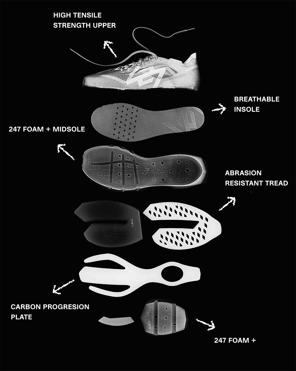 Carbon Progression Plate: Carbon-infused Pebax PA12 plate provides propulsion for running while maintaining stability under lateral and loaded movements.