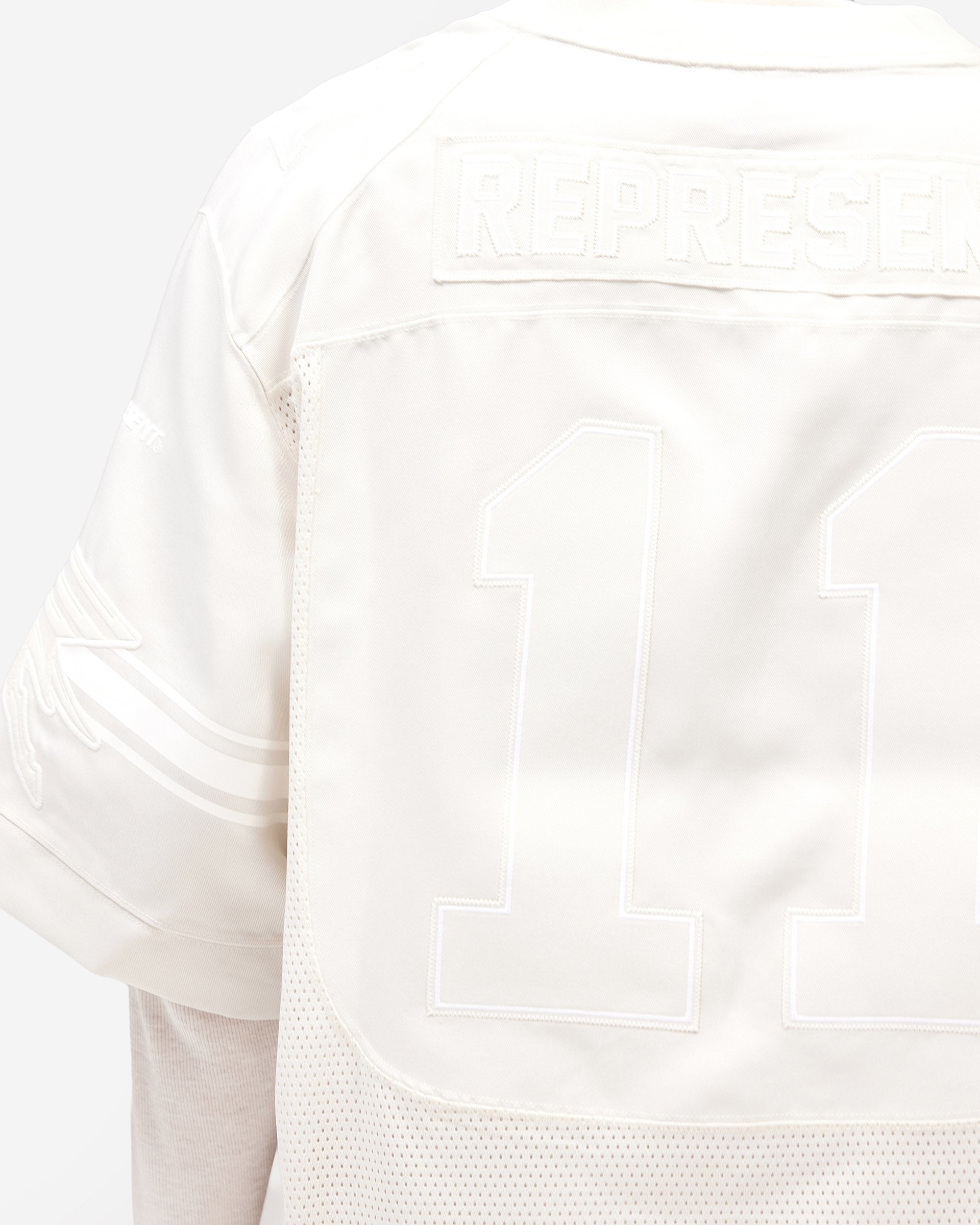 La construction combine plusieurs techniques. Un tissu sergé forme la base, contrasté par des panneaux en mesh qui apportent dynamisme visuel et respirabilité. Les graphismes sont réalisés par un trio de méthodes—appliqué, broderie et impression—créant un intérêt visuel superposé et une profondeur texturale. Le résultat est une pièce qui se lit comme un sportswear inspiré de la performance, tout en conservant les standards de confection raffinés que Represent applique à toutes ses catégories. Une nostalgie portable au service d’une intention contemporaine.