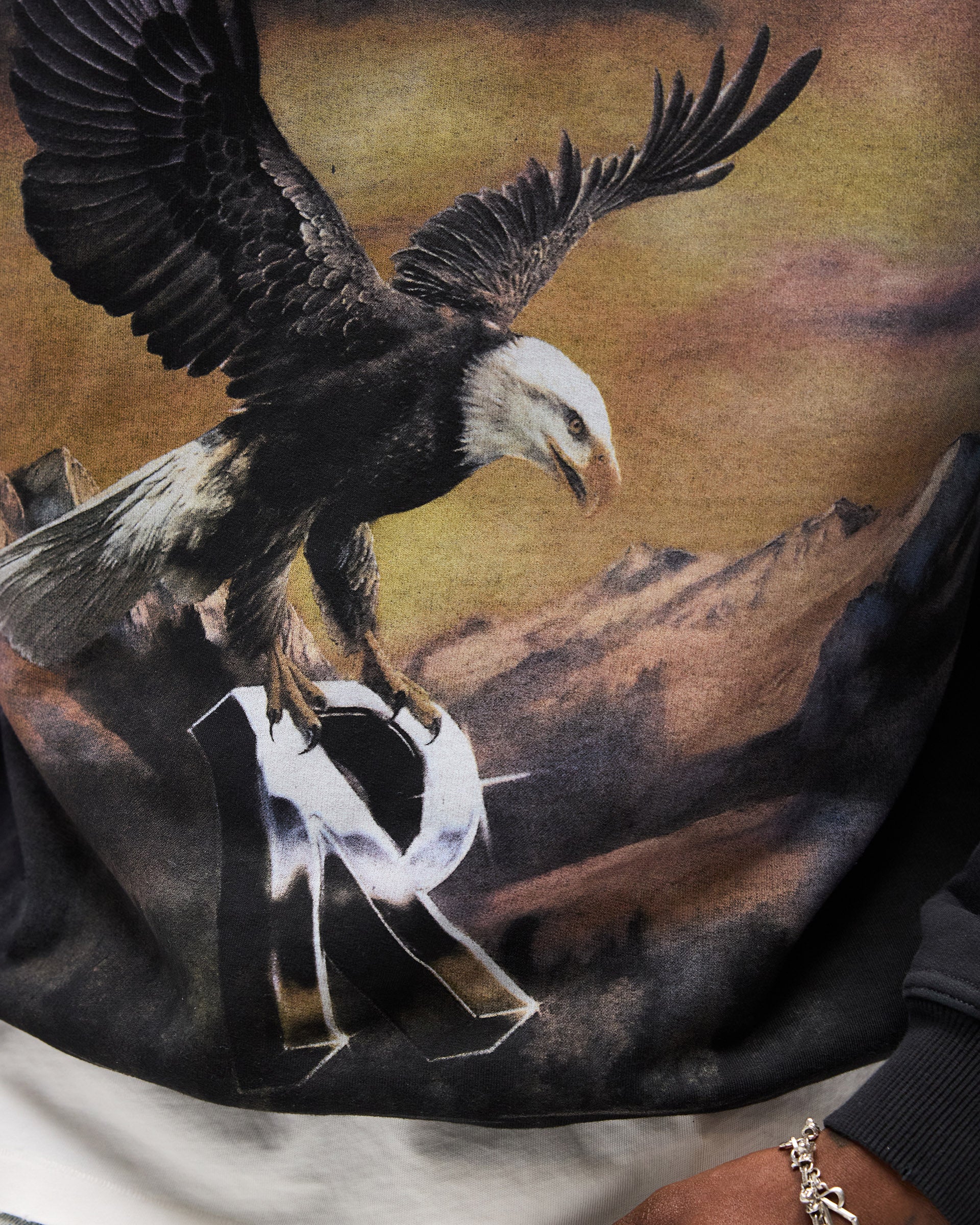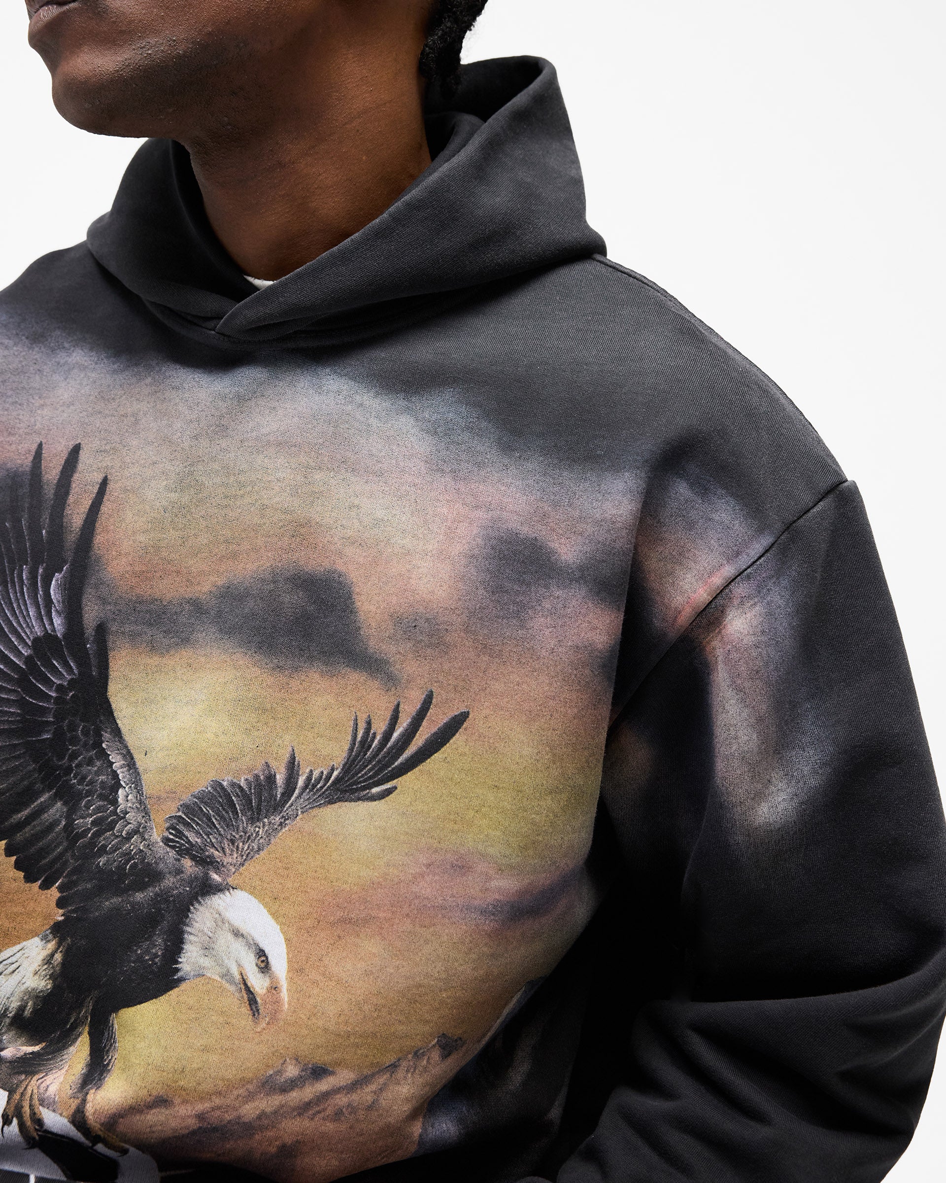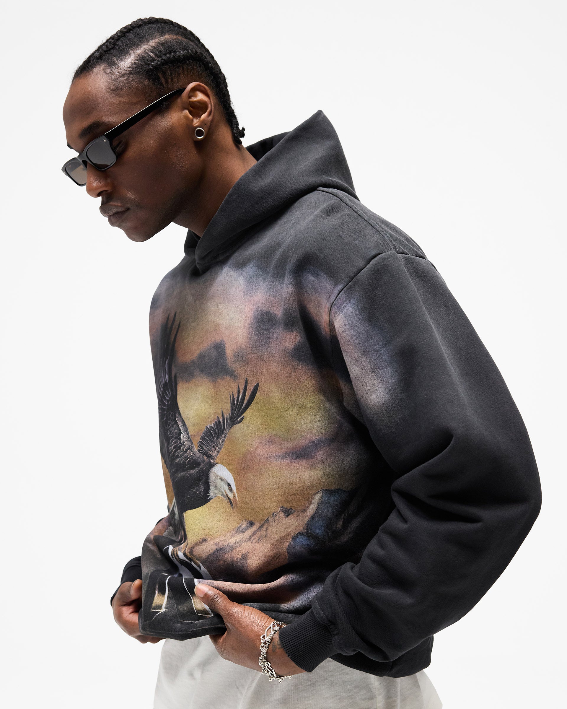 Présentation du Chrome Flight Hoodie en Stained Black, un hoodie oversized confectionné en jersey de coton poids lourd avec une finition tachée effet porté. Un large graphique d’aigle domine l’avant, sur un paysage de montagne, avec l’Initial Represent intégrée dans la paroi rocheuse en dessous.