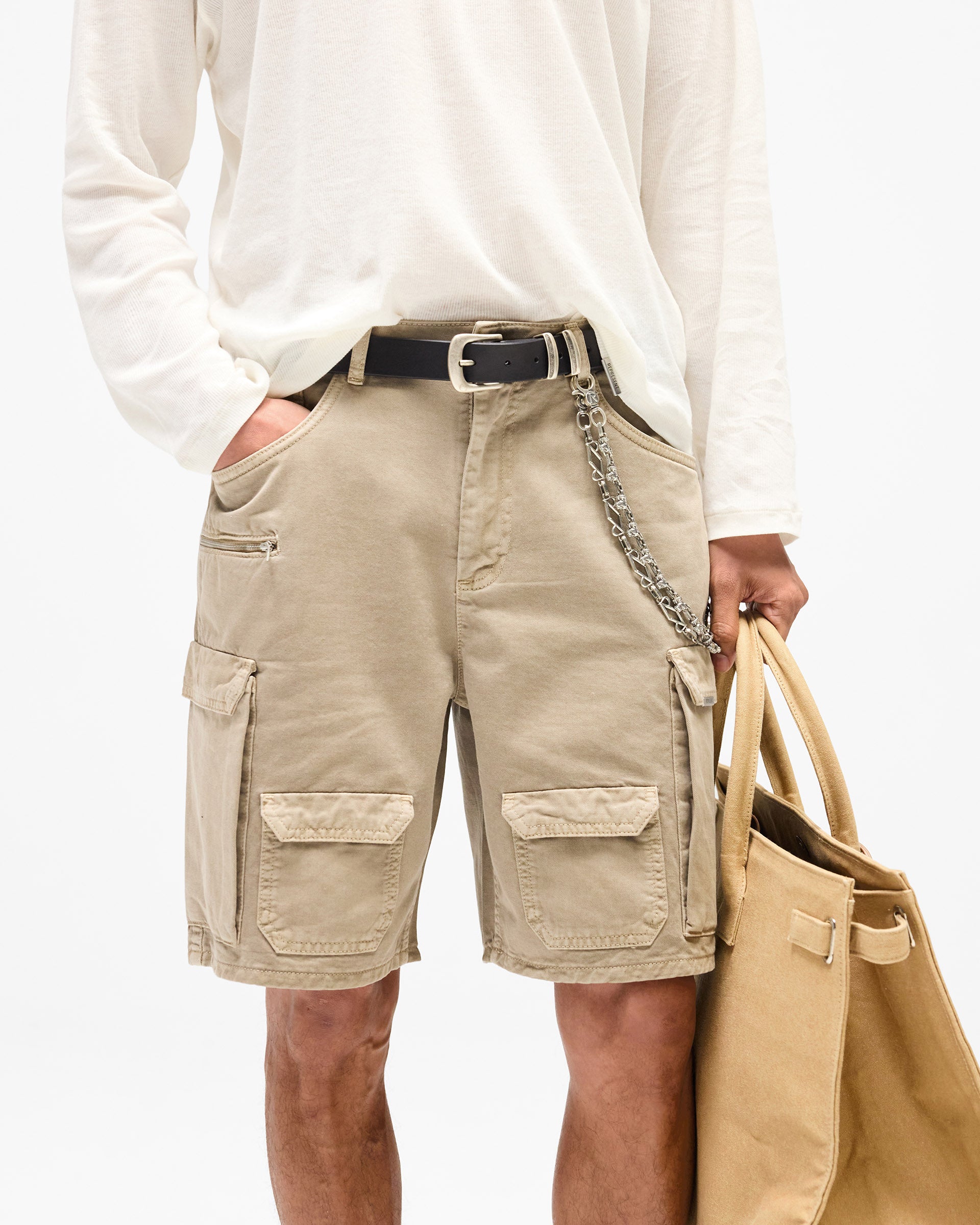 Présentation du Short Cargo Loaded en Beige, un short cargo décontracté confectionné en serge de coton lavée avec une finition vintage, effet porté. Sa construction multi-poches présente des poches cargo à rabat et zippées à l’avant et sur les côtés, pour une silhouette utilitaire inspirée du workwear.