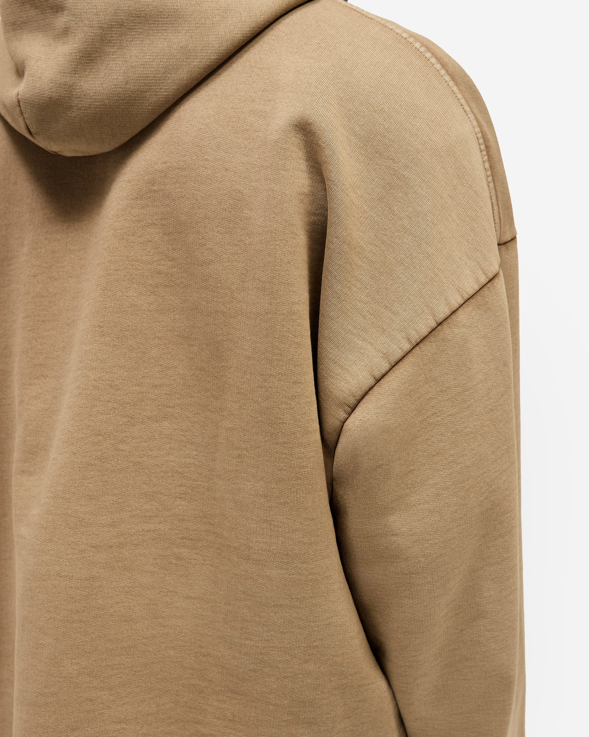 Présentation du Hoodie Represent Embellished en Vintage Khaki, un hoodie oversized confectionné en jersey de coton poids lourd avec une finition lavée Vintage. Le devant présente le logo Represent arqué réalisé en clous griffes métalliques individuels, ton sur ton sur la base kaki pour un effet subtil et texturé.