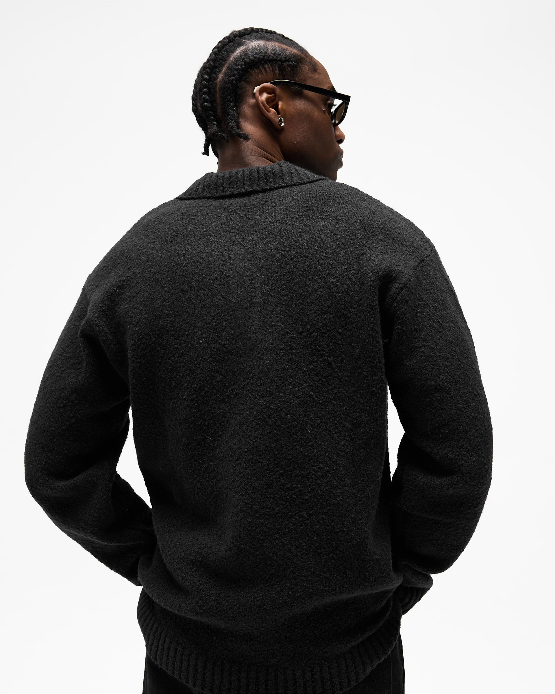 Introducing the Knitted Boucle Polo in Jet Black, a relaxed knitted polo crafted from a textured boucle yarn with a soft, tactile hand-feel. The open polo collar and V-neckline sit over a relaxed, oversized silhouette designed for effortless transitional layering.