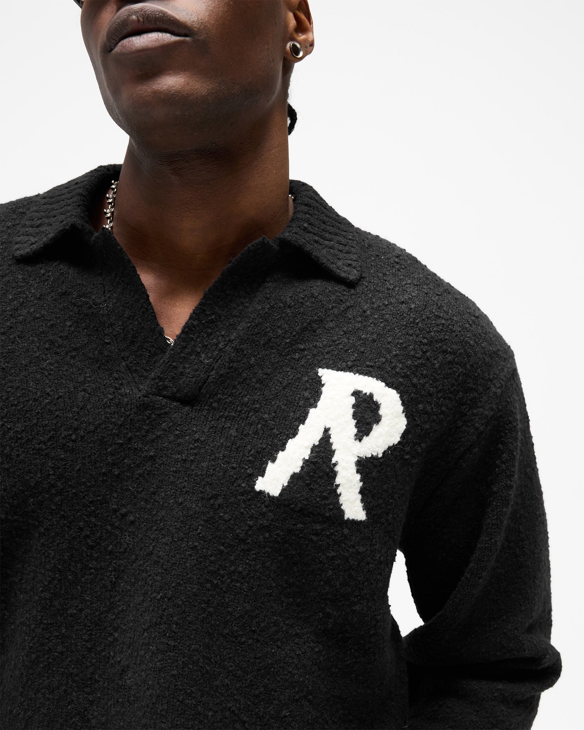Featuring an intarsia knit Represent initial in a contrast white tone to the left chest. Finished with ribbed collar, cuffs and hem for a clean, structured edge.