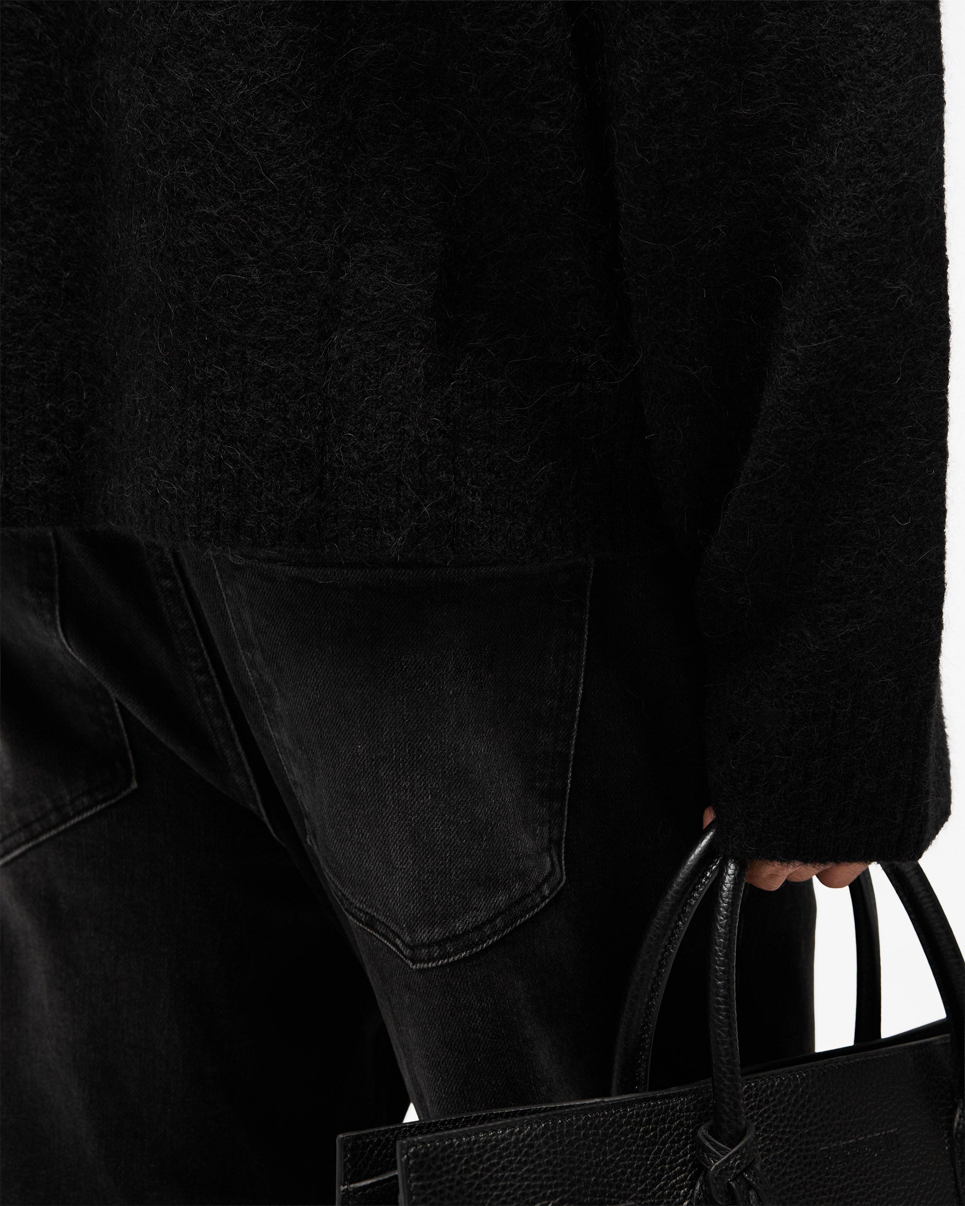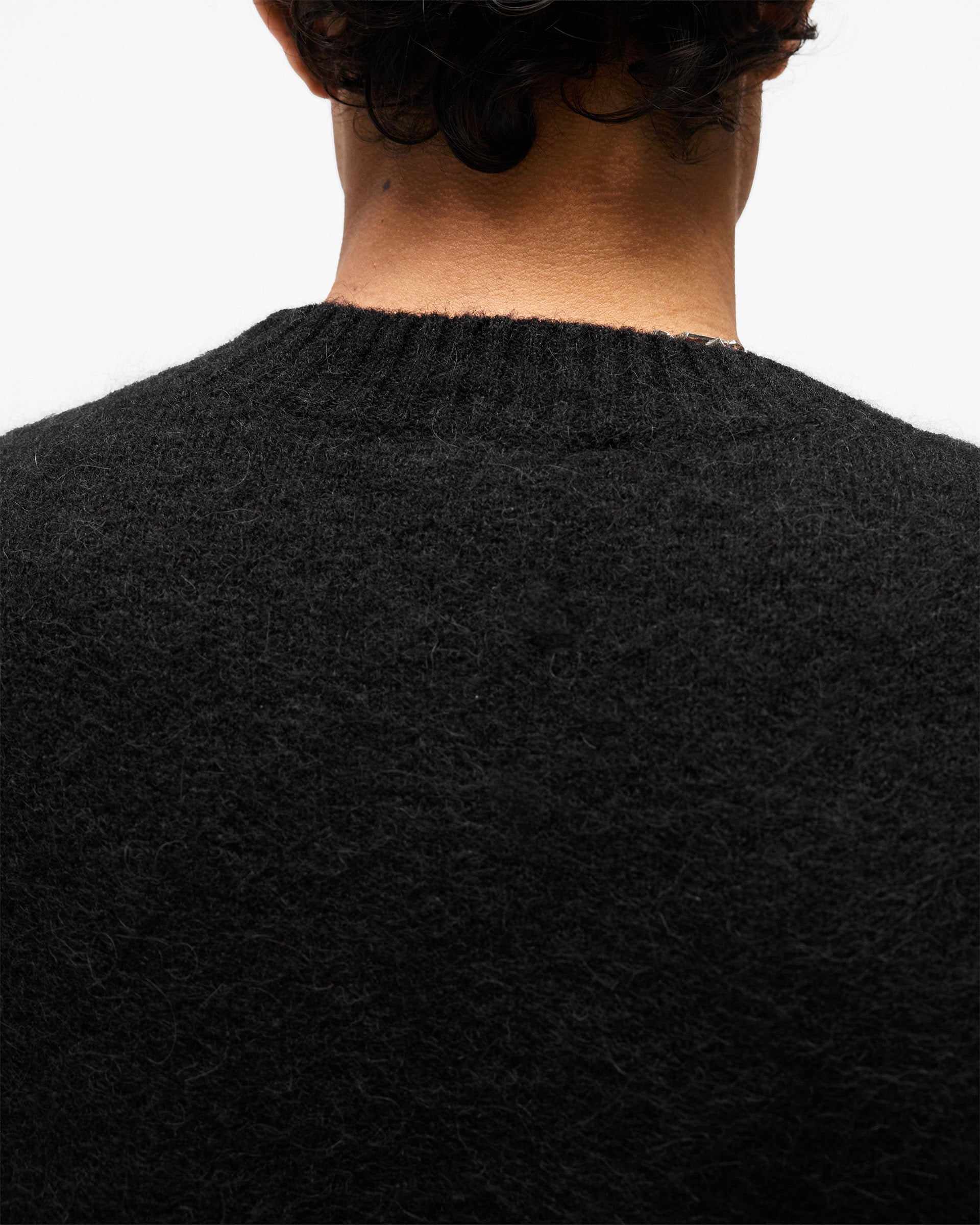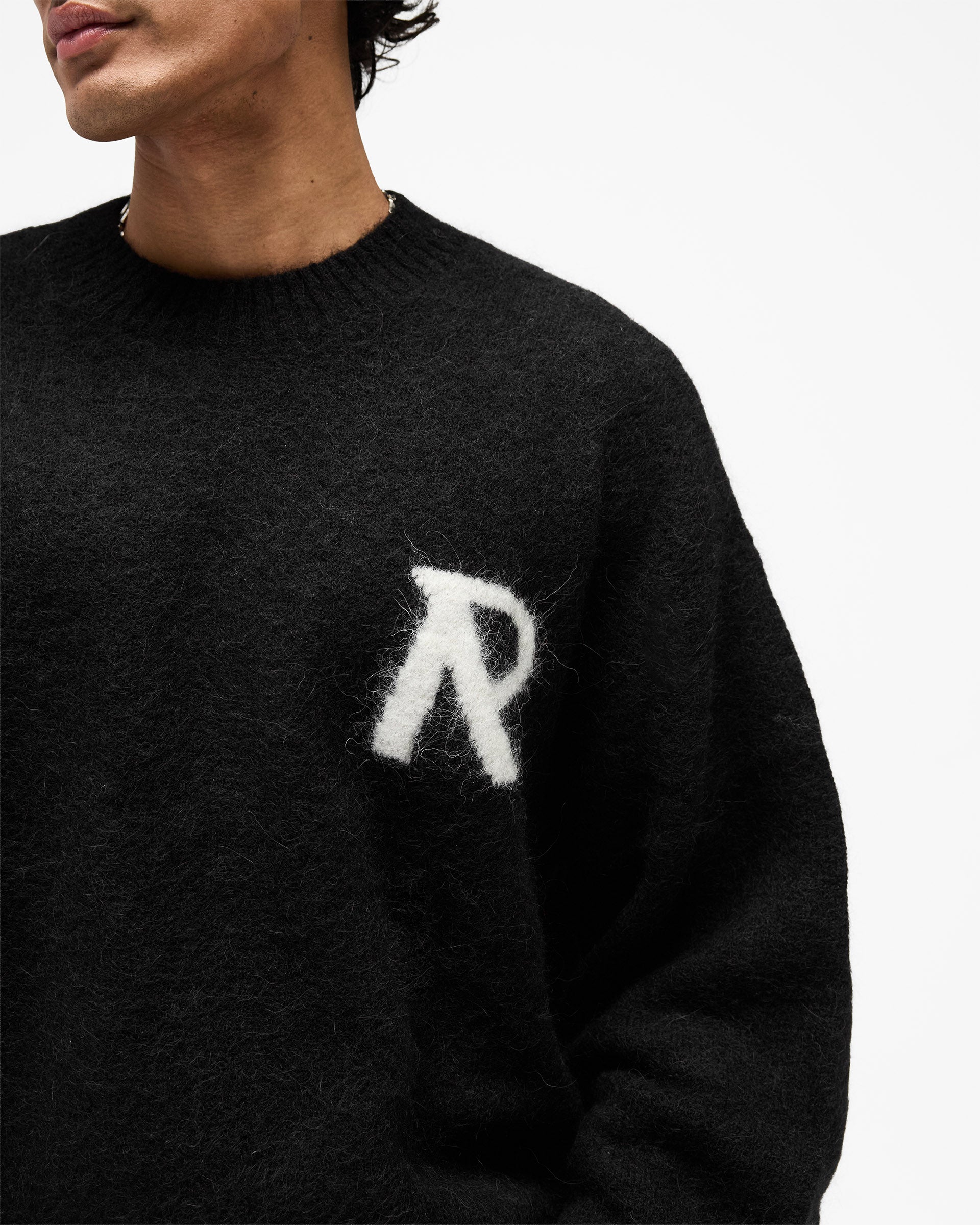 Introducing the Logo Knit Sweater in Jet Black, a relaxed crew neck sweater crafted from a brushed knit yarn with a soft, textured hand-feel. The intarsia knit Represent initial sits in a contrast white tone to the left chest, adding a clean branding detail against the black base.