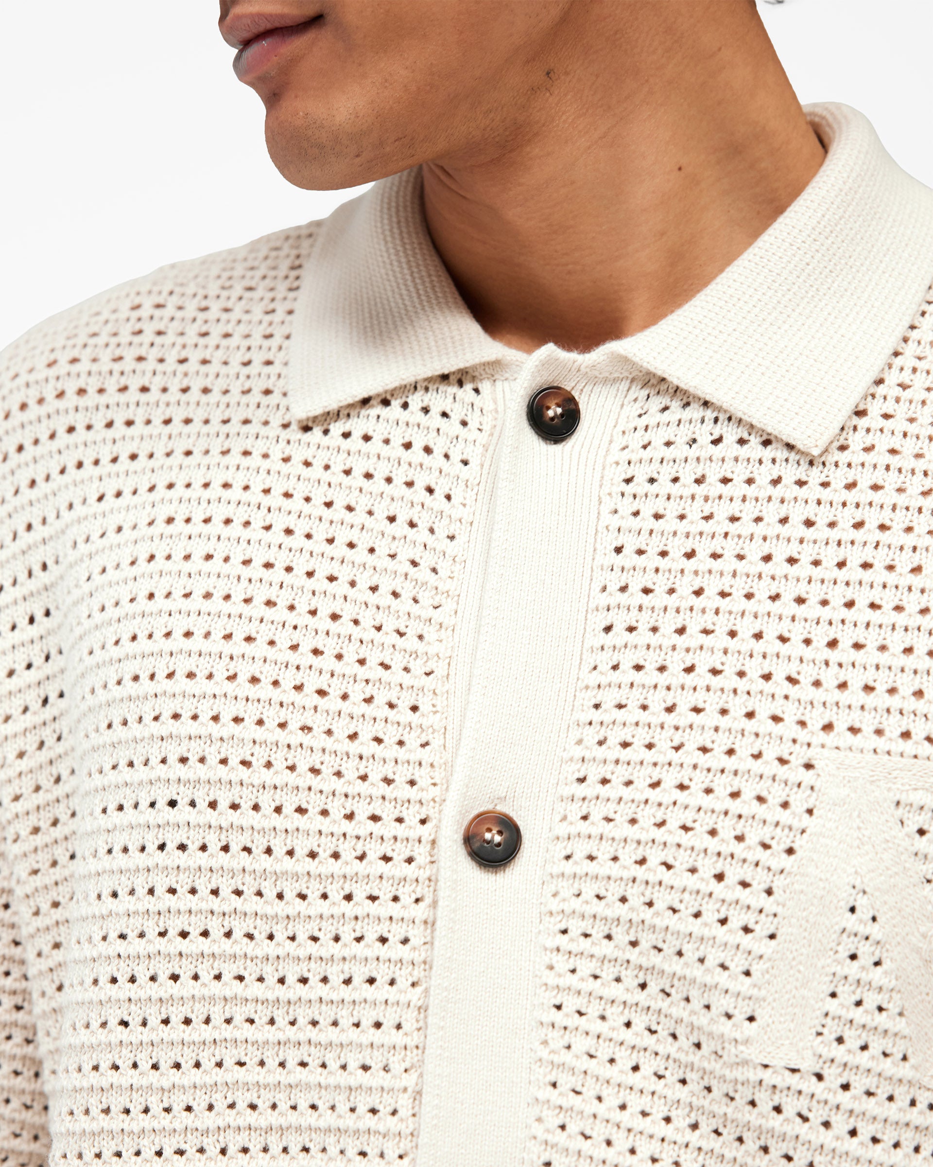 Introducing the Pico Knit Shirt in Ecru, a refined short-sleeve shirt built from open knit 7GG cotton. Featuring a Milano knit collar with collar stand, a full needle placket, an embroidered initial at the chest, and tubular finish to hem and cuffs, this piece demonstrates construction care throughout. Fully linked seams ensure durability, while the open knit fabric creates a breathable, refined aesthetic suitable for layering or standalone wear.