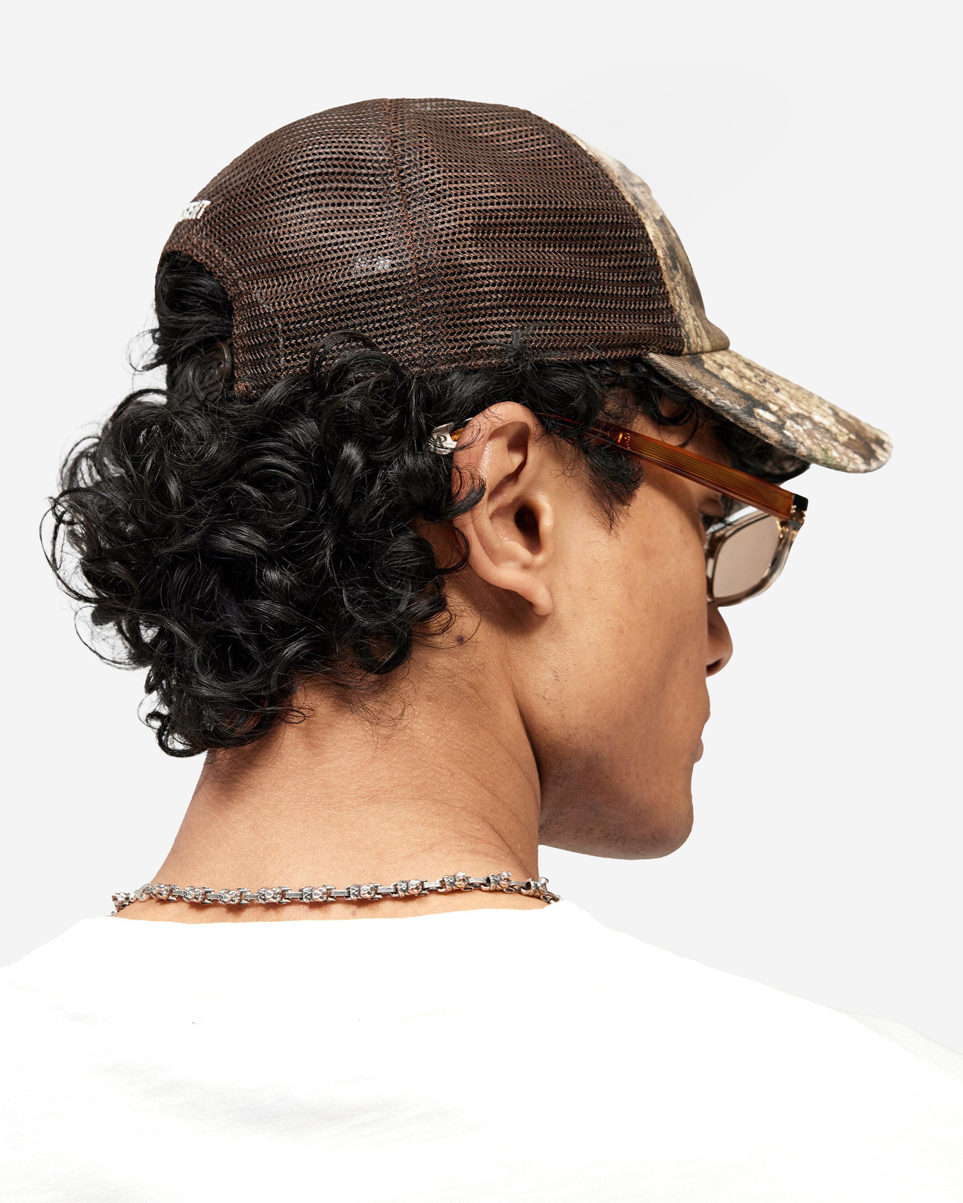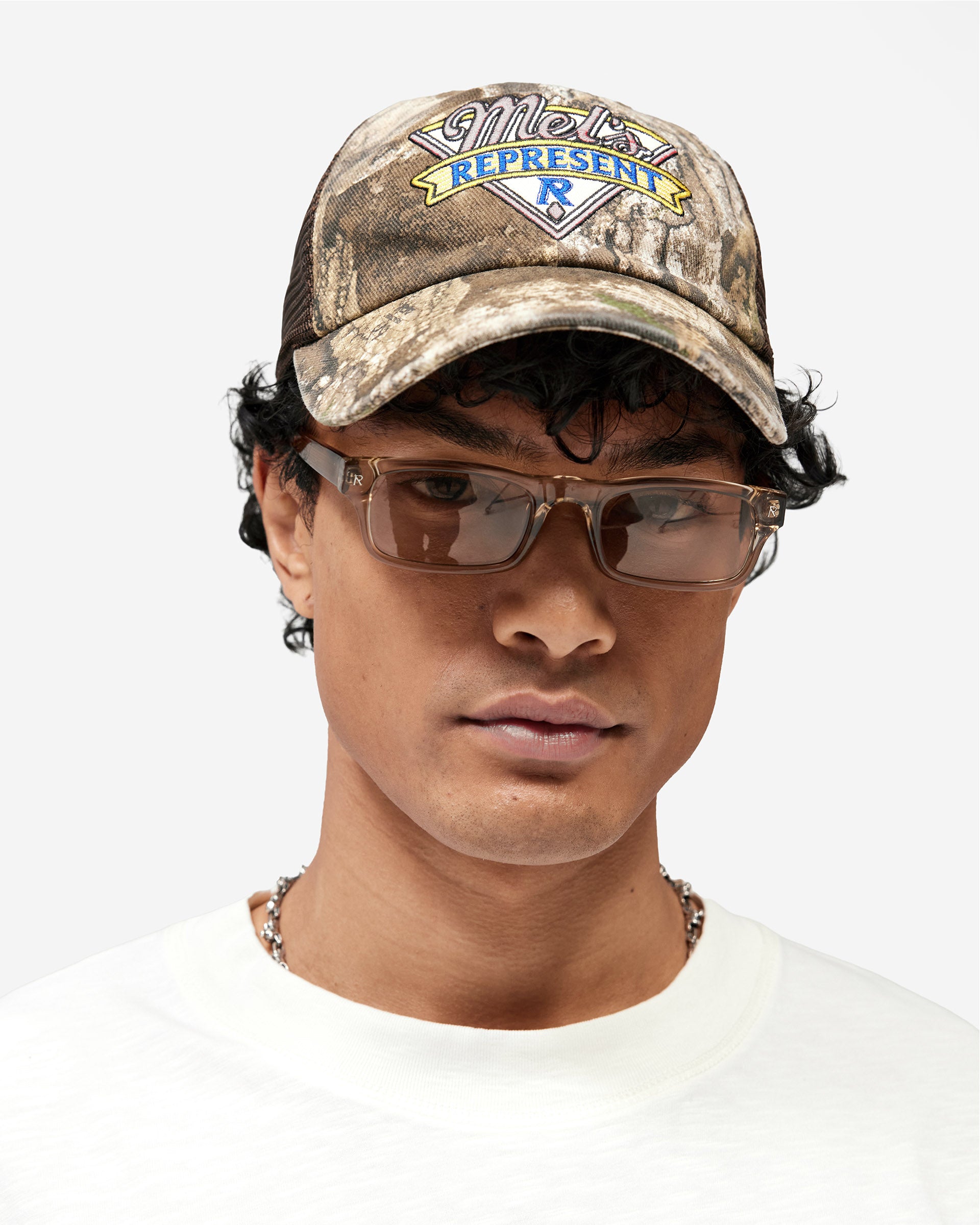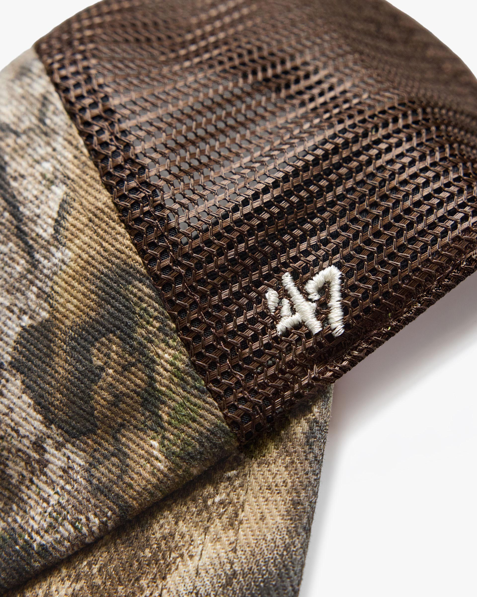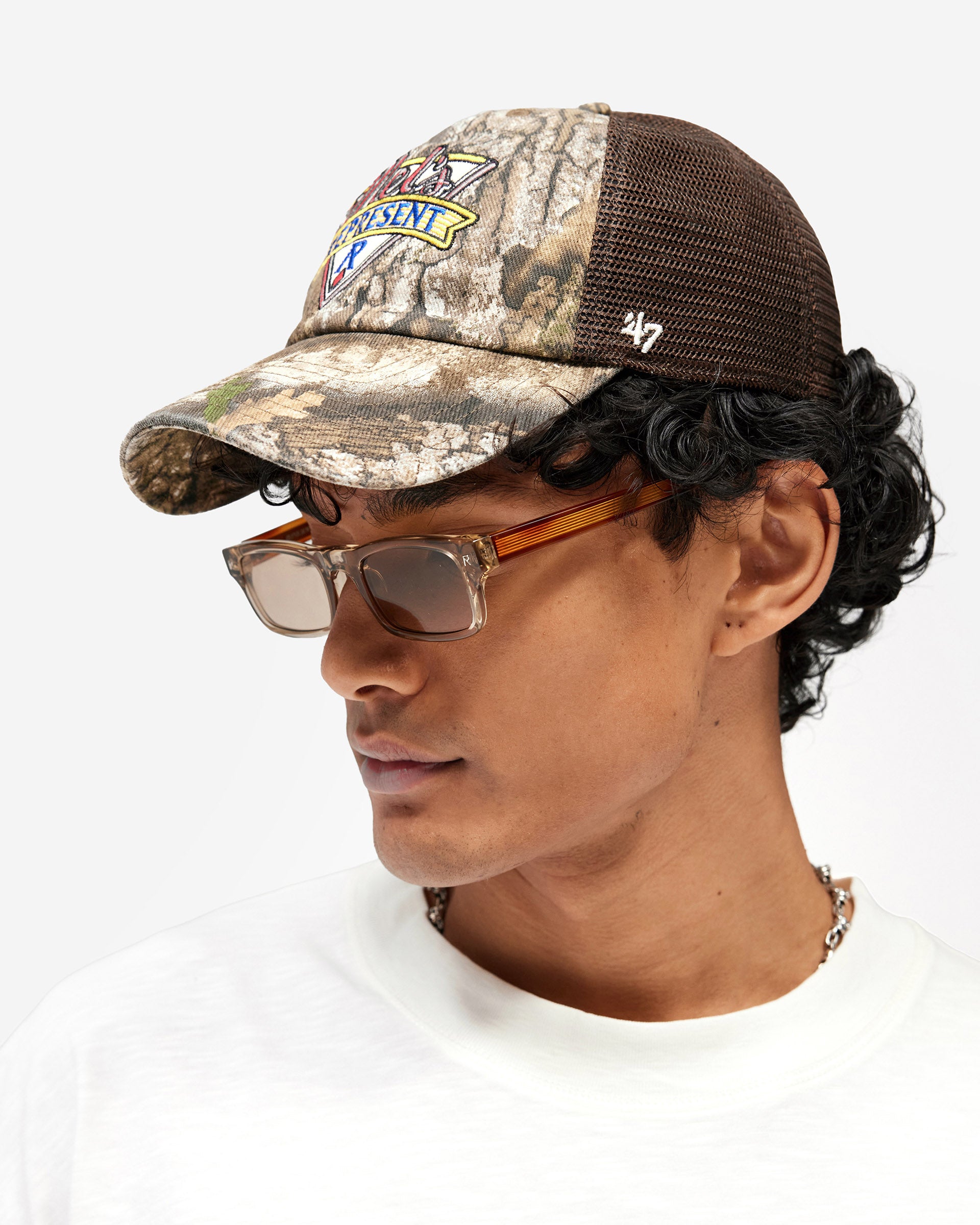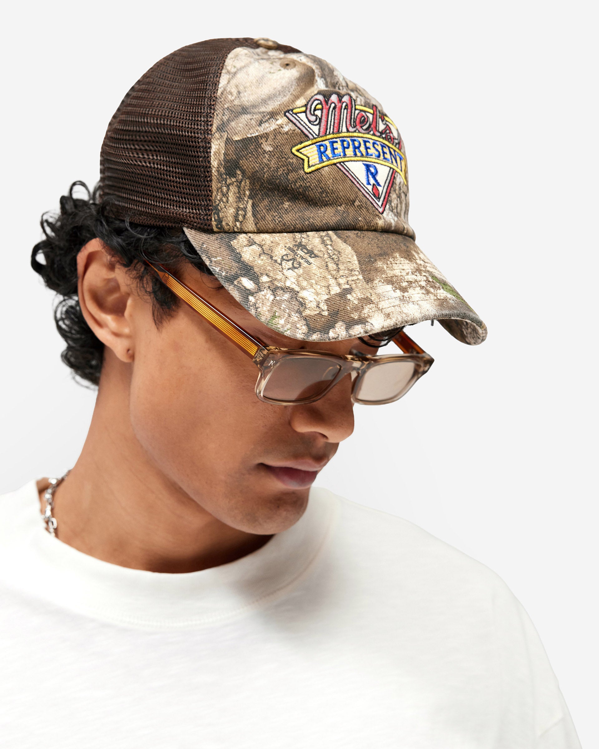 Introducing the Represent x Mel's Diner Realtree x '47 Cap in Real Tree, a five-panel trucker cap built in collaboration with Mel's Diner and '47 Brand. The cotton twill front panel and curved brim are finished in a Realtree camouflage print with a vintage wash, while the brown mesh back panel delivers a classic trucker silhouette with breathability.