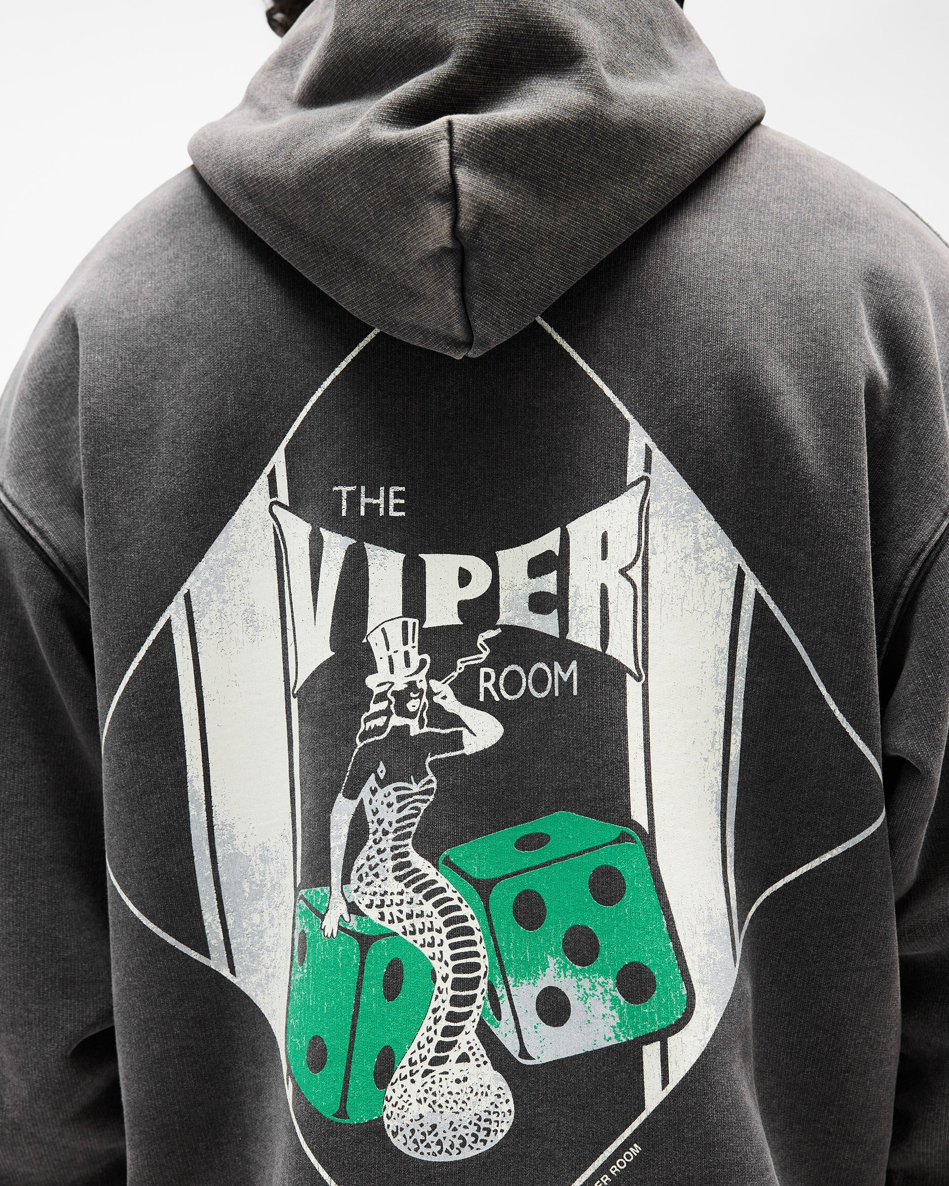 Introducing the Viper Room Dice Hoodie in Vintage Grey, a collaboration that celebrates one of Los Angeles' most iconic cultural institutions. Born from a partnership with the legendary Sunset Strip venue, this hoodie channels the venue's historic energy through front and back graphics and embellished gem stone branding at the hem. Built from 485GSM cotton with standard oversized proportions, a signature metal bar at the kangaroo pocket opening, minimal distressing, and a double-layer hood, this piece merges Represent's design heritage with Viper Room's cultural legacy.